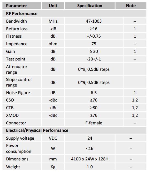 2. Maximum distortions at 40dBmV output, NTSC 77 channels loading+75 channels 256 QAM